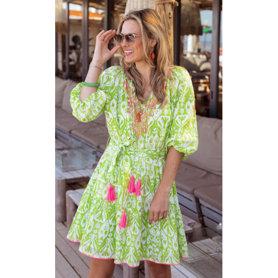 Expertly crafted, this Place du Soleil Dress features vibrant green fabric and elegant elbow length balloon sleeves. The pink edging on the hem and neckline adds a touch of feminine charm, while the delicate embroidery on the neckline elevates the overall design. Complete with a tie adorned with pink tassels, this dress effortlessly combines style and sophistication.